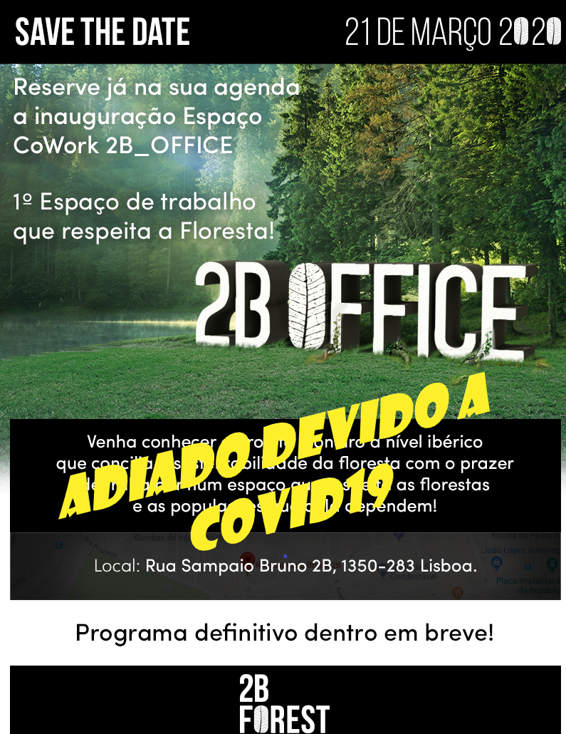 Devido aos desenvolvimentos da última semana inerentes ao COVID 19 – Coronavírus em Portugal, atendendo igualmente a preocupações já manifestadas por alguns Participantes e como medida de cidadania, vimos informar que a sessão de inauguração, e respetiva abertura ao público, do 2B_OFFICE será adiada até haver novas orientações da Direção Geral de Saúde.