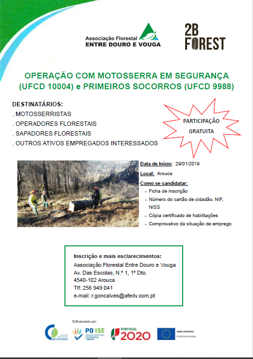 A 2BForest, no âmbito do seu projeto "+Floresta +Segurança +Certificação", associa-se à seu parceiro Associação Florestal Entre Douro e Vouga para promover uma formação "Operação com motoserra e Primeiros Socorros".