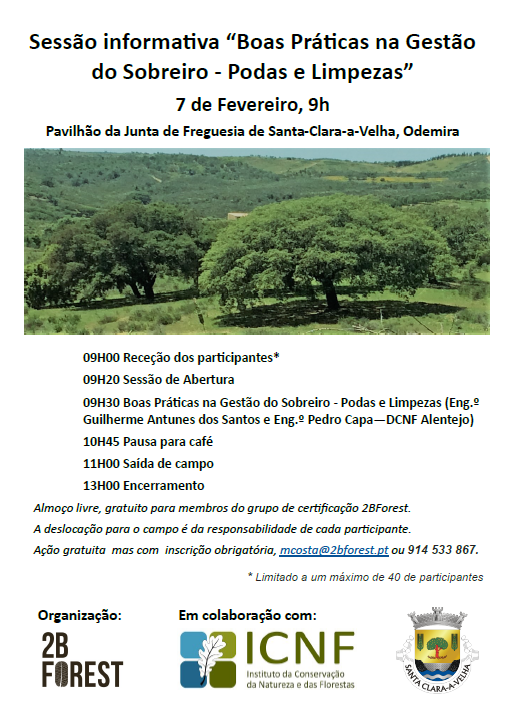 11h00 - Receção dos participantes 11h15 - Abertura (Dr. Ricardo Cardoso, Vereador da CM Odemira | Eng.ª Susana Brígido, 2BForest) 11h30 - Boas Práticas de gestão em Povoamentos de Sobreiro, ICNF, Eng.º Guilherme Santos 11h45 - Desafios e oportunidades da gestão do medronhal autóctone, Associação Arbutus, Afonso Pereira, Presidente da Associação 12h00 - Projetos inovadores na gestão do eucaliptal, TNC, Engª Teresa Silva, Eng.º José Luis Carvalho 12h15 - A certificação florestal e a melhoria da produtividade, 2BForest, Eng.ª Maura Costa 12h30 - Discussão 13h00 - Almoço convívio Entrada livre. Reserva obrigatória limitadas para almoço gratuito até dia 18/Jul: mcosta@2bforest.pt